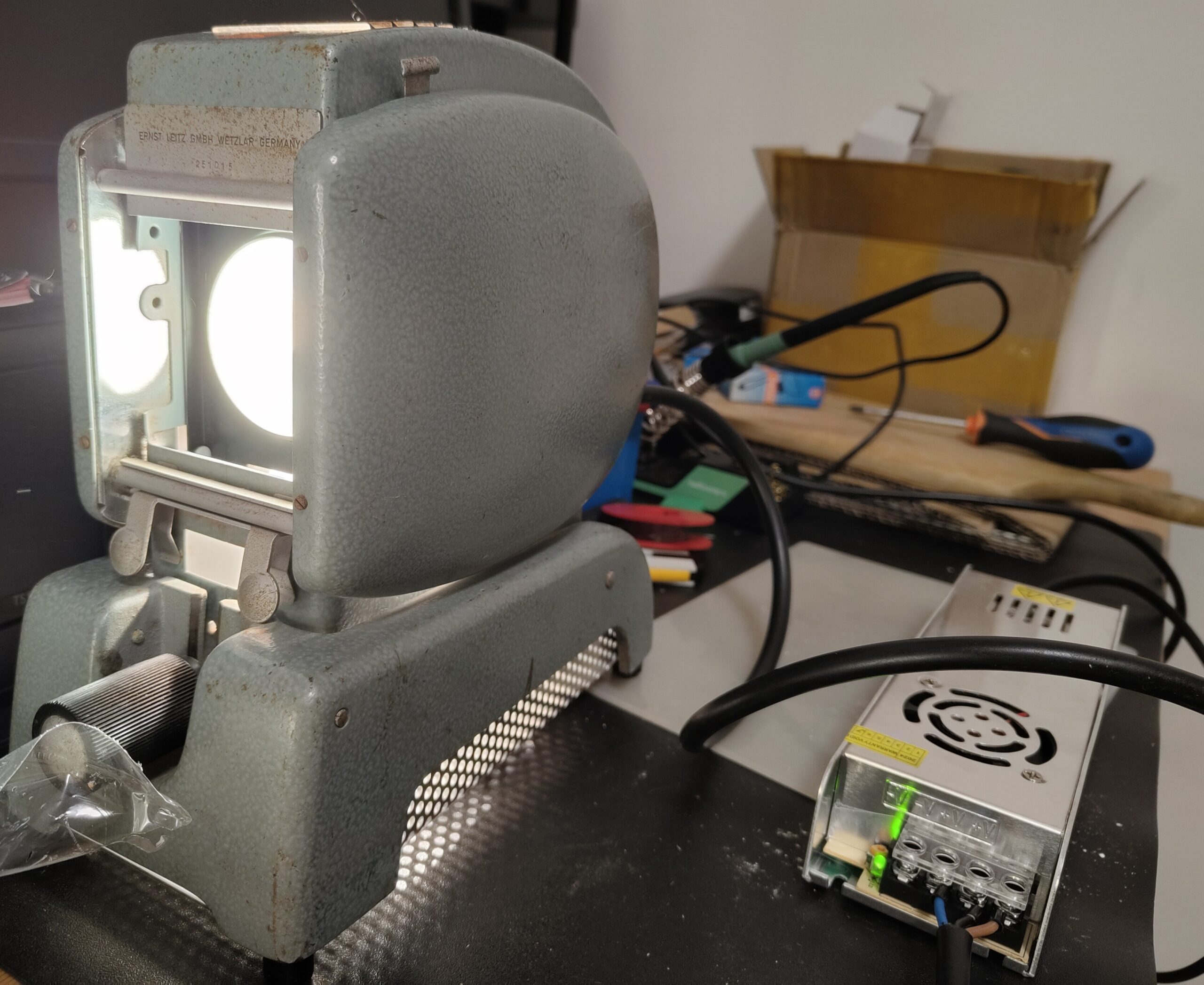 Some time later, we began working together, combining my technical expertise with the ideas and needs of the Kino Manual duo. It all started with an idea: "What if we could replace outdated, hard-to-find projector bulbs with newer equivalents?" Over the time, we modified and improved various projectors—not just changing bulbs, but adding cooling systems, microcontroller-controlled stepper motors, and creating an entire power supply and brightness control system that I tried to adapt to the needs of installations and performances.